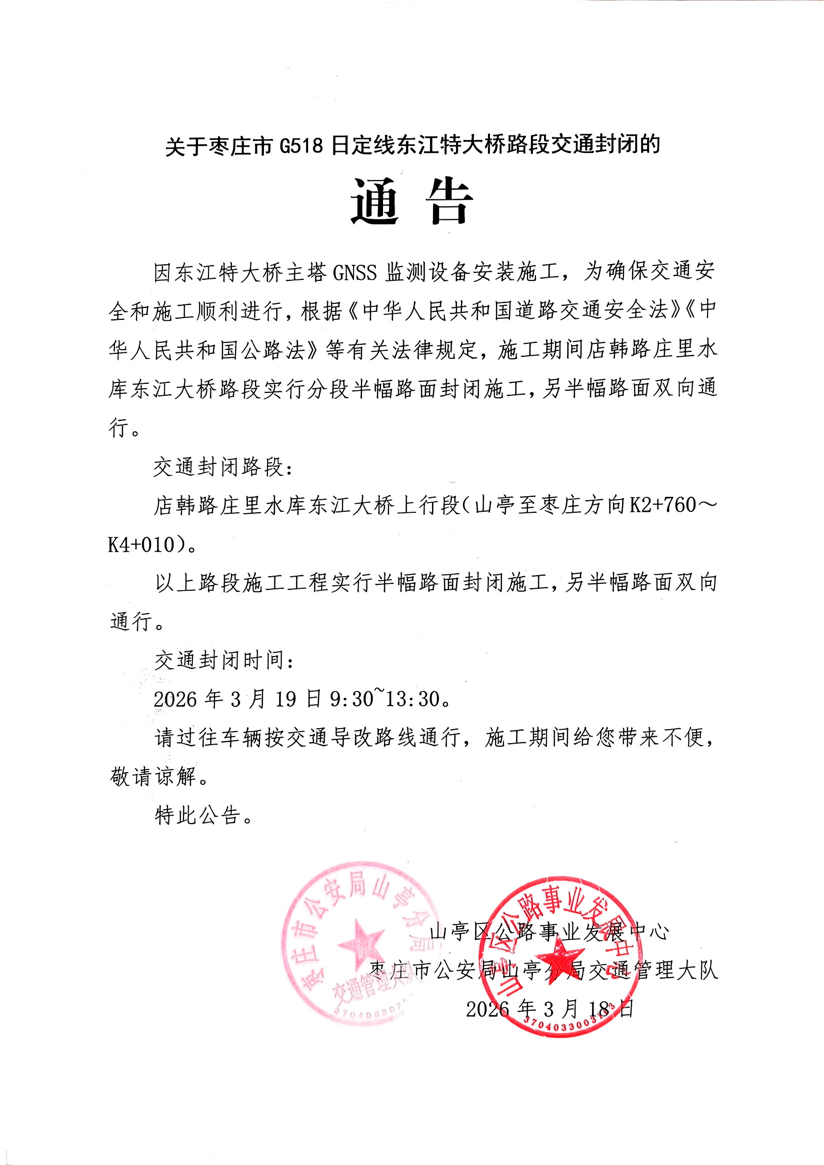 关于枣庄市G518日定线东江特大桥路段交通封闭的通告